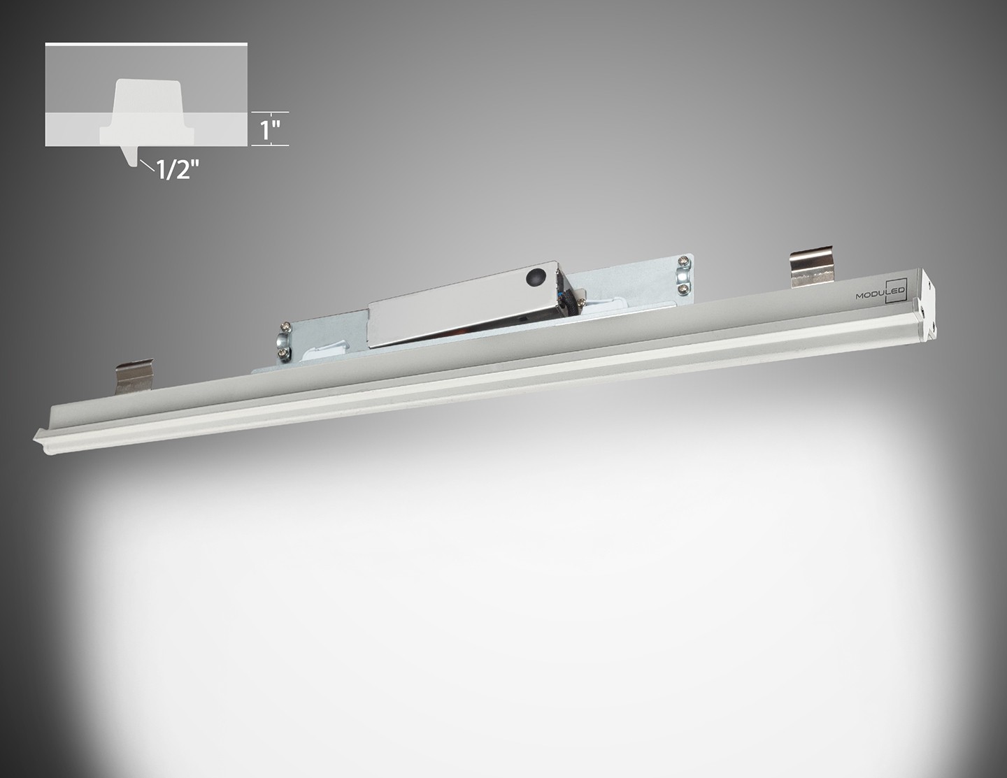 MC7 linear wall washer illuminates and grazes wall surfaces from the Stealth 120V AC Line Voltage Linear Slot Lighting System. The 3/8" valance conceals the reflector optics and distributes all light output towards any nearby vertical surface. The unique 'shell' optic provides powerful and even illumination from ceiling to floor with no artifacts. As part of the Stealth family of products, the MC7 can be used independently or set in combination with others to illuminate very large vertical areas common to infrastructure, transportation hubs, museums, galleries, etc. Spacer plates can be used in between fixtures or the MC7 can be combined with other adjoining fixtures such as downlights, diffuse lenses, decorative pendants, and adjustable accent fixtures.